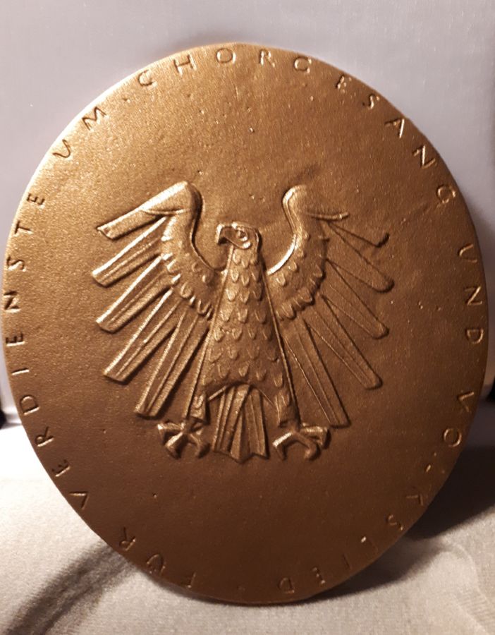 Eine Woche nach der “Schöpfung” kam die 775 Gramm schwere (!) Bronzeplakette und die dazu gehörende, vom Bundespräsidenten unterschriebene Urkunde im Stuttgarter Rathaus an und erreichte in der ersten Augustwoche endlich den 175 Jahre jungen Stuttgarter Oratorienchor.