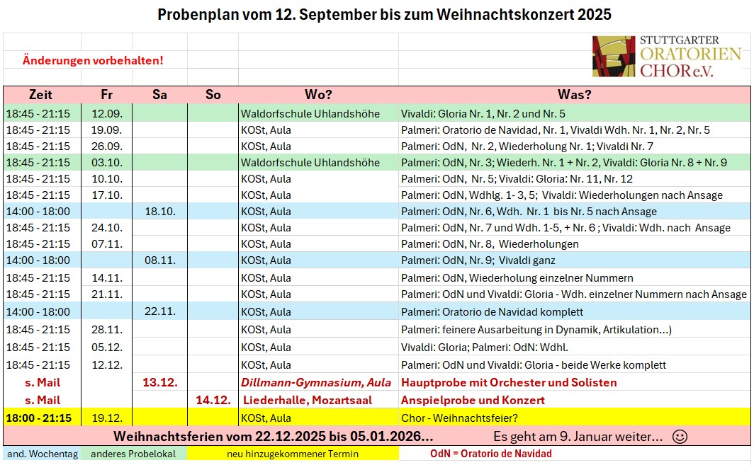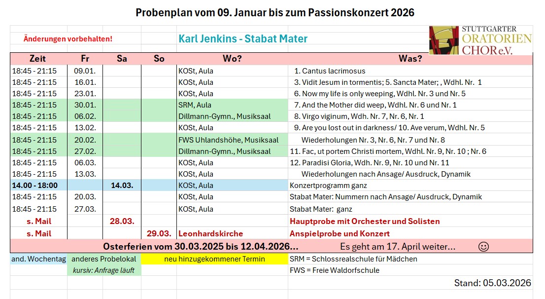 Der Stuttgarter Oratorienchor e.V. besitzt leider keinen eigenen Proberaum. Normalerweise ist es bei laufendem Schulbetrieb kein Problem, freitags in der Aula des Königin Olga Stifts zu proben. Auf Grund unserer satzungsgemäß festgelegten drei (!) Konzerte im Jahr ist die Zeit zur Erarbeitung anspruchsvoller sakraler Chorliteratur oft knapp und manchmal können wir auf schulfreie Freitage nicht verzichten. Hin und wieder wird die Aula auch von der Schule selbst benötigt und so müssen wir uns regelmäßig um räumlichen Ersatz kümmern oder ausnahmsweise auf einen anderen Wochentag ausweichen.